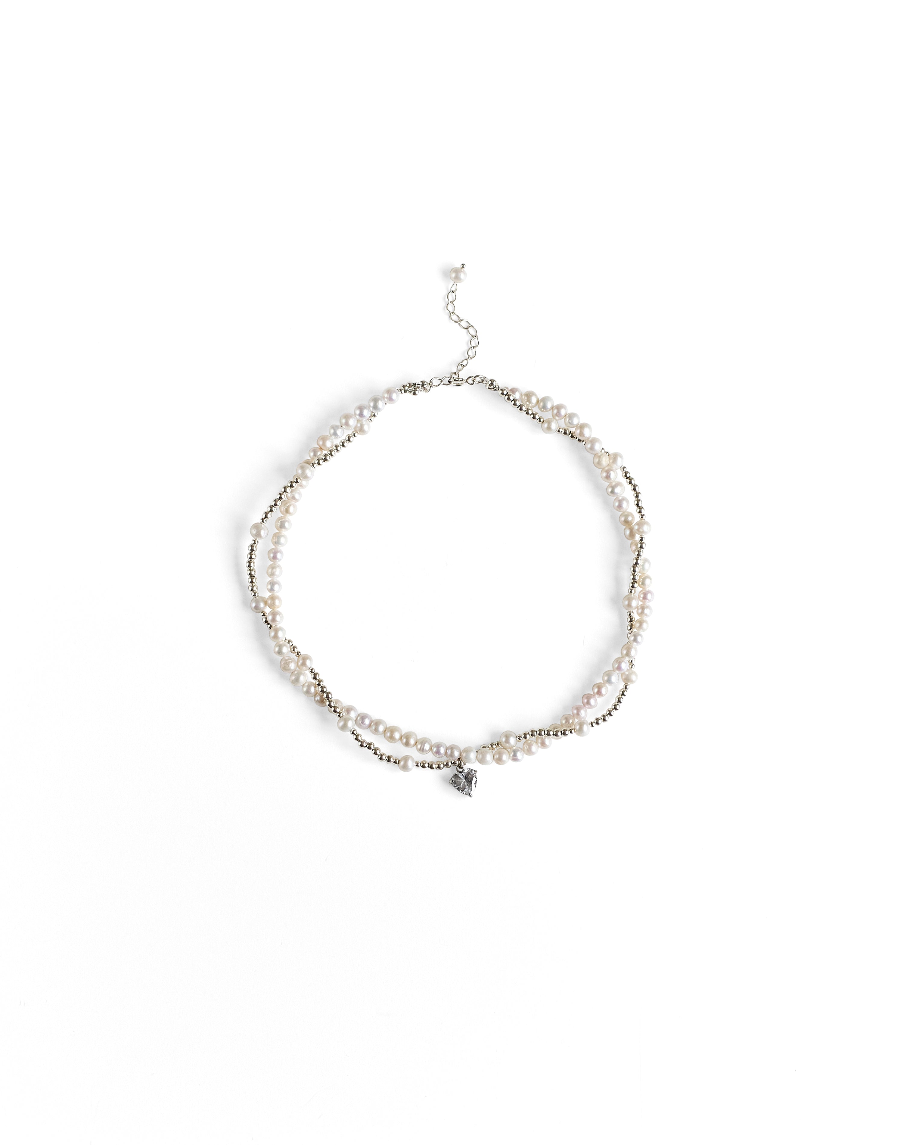 Переплетене кольє з двох низок: срібної, з намистин 925 проби та вставками річкових перлин та округлих дрібних натуральних перлів. Кулон серце з білого (прозорого) фіаніту
