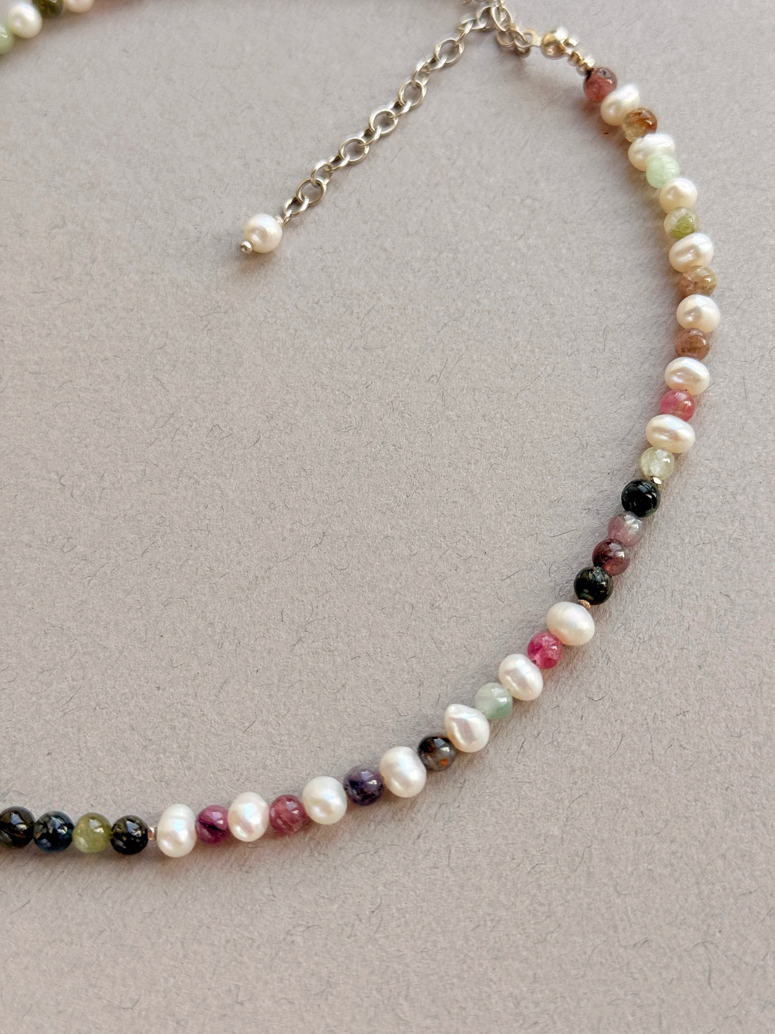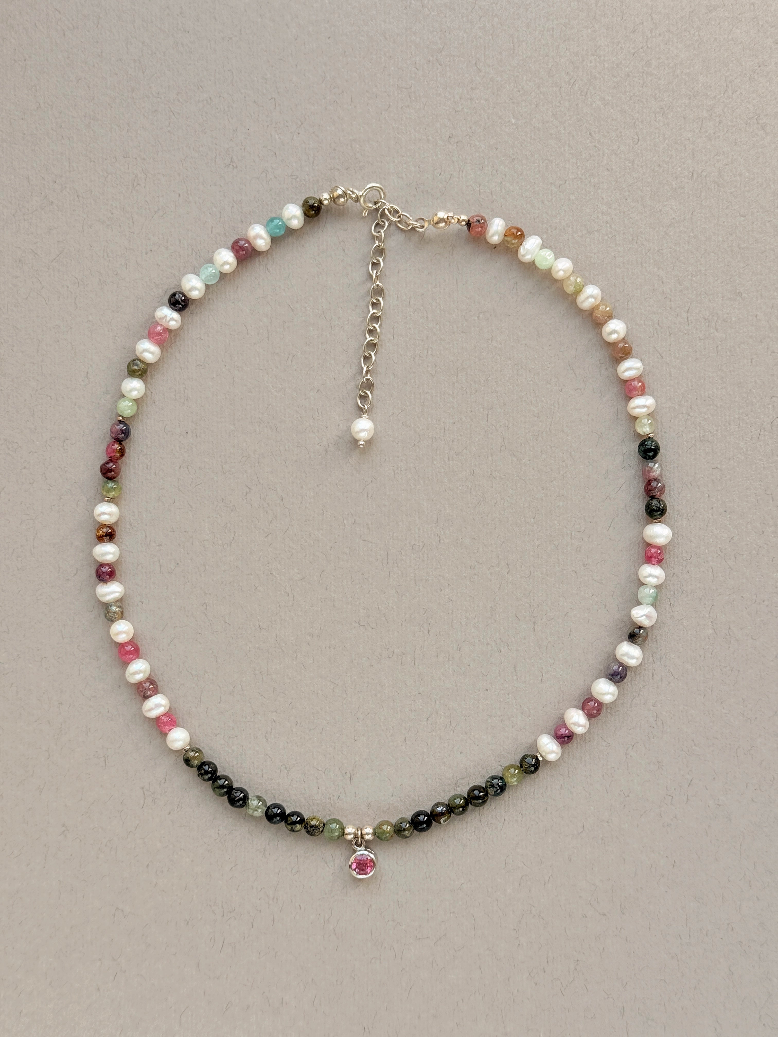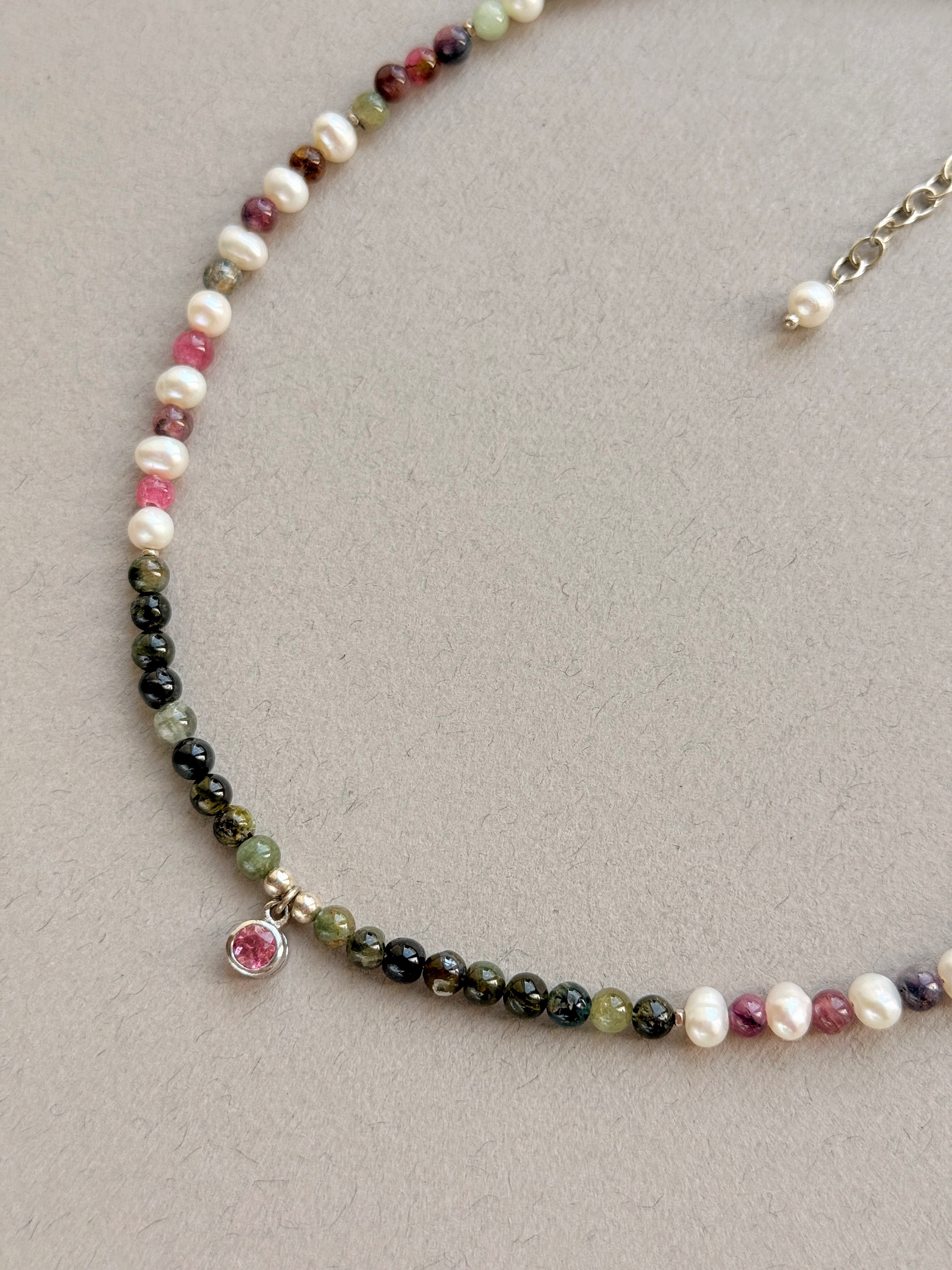 Літнє кольє з дорогоцінного тармаліну та річкових перлин. Кулон з рідкісного рожевого турмаліну - рубеліту.