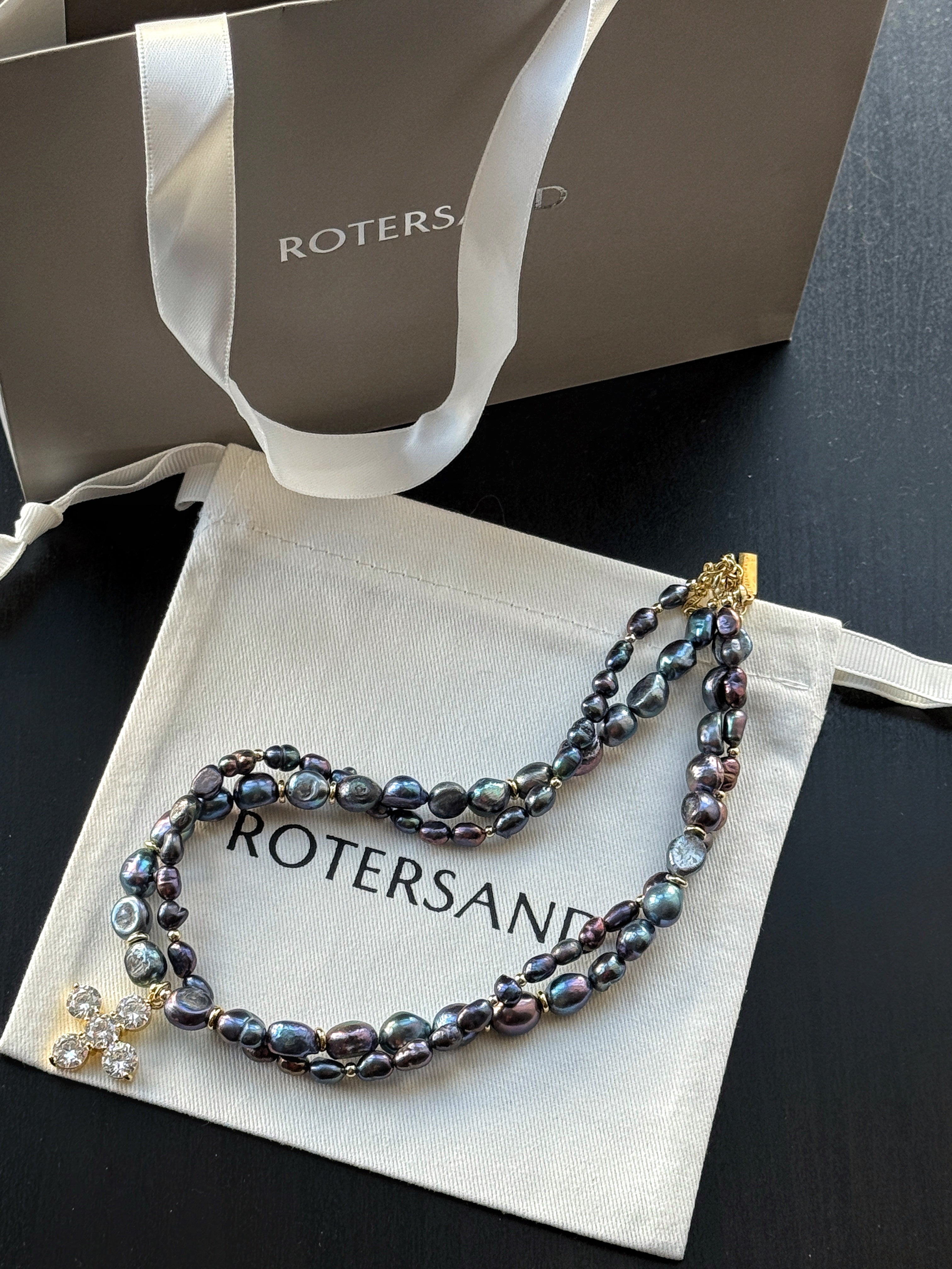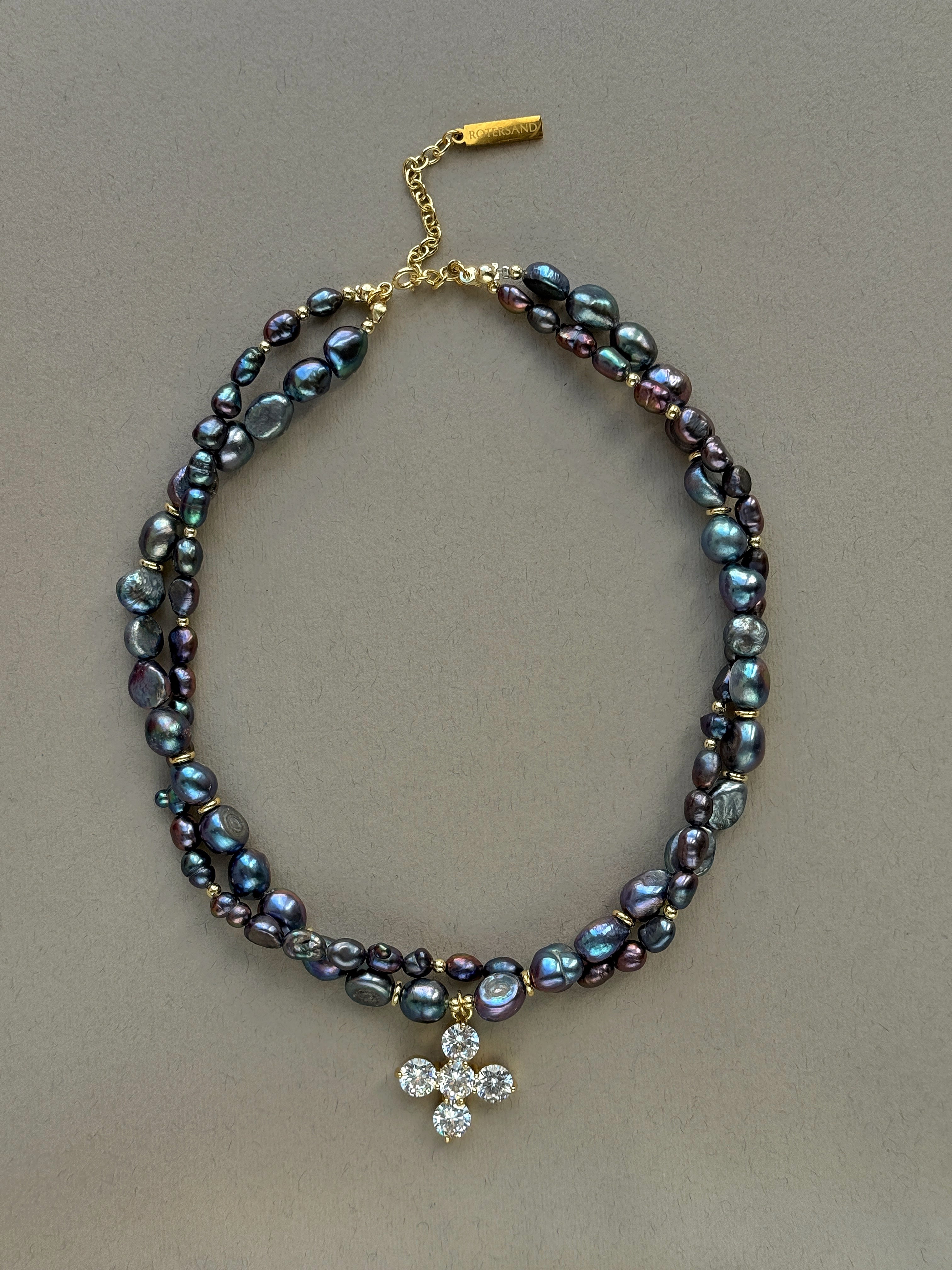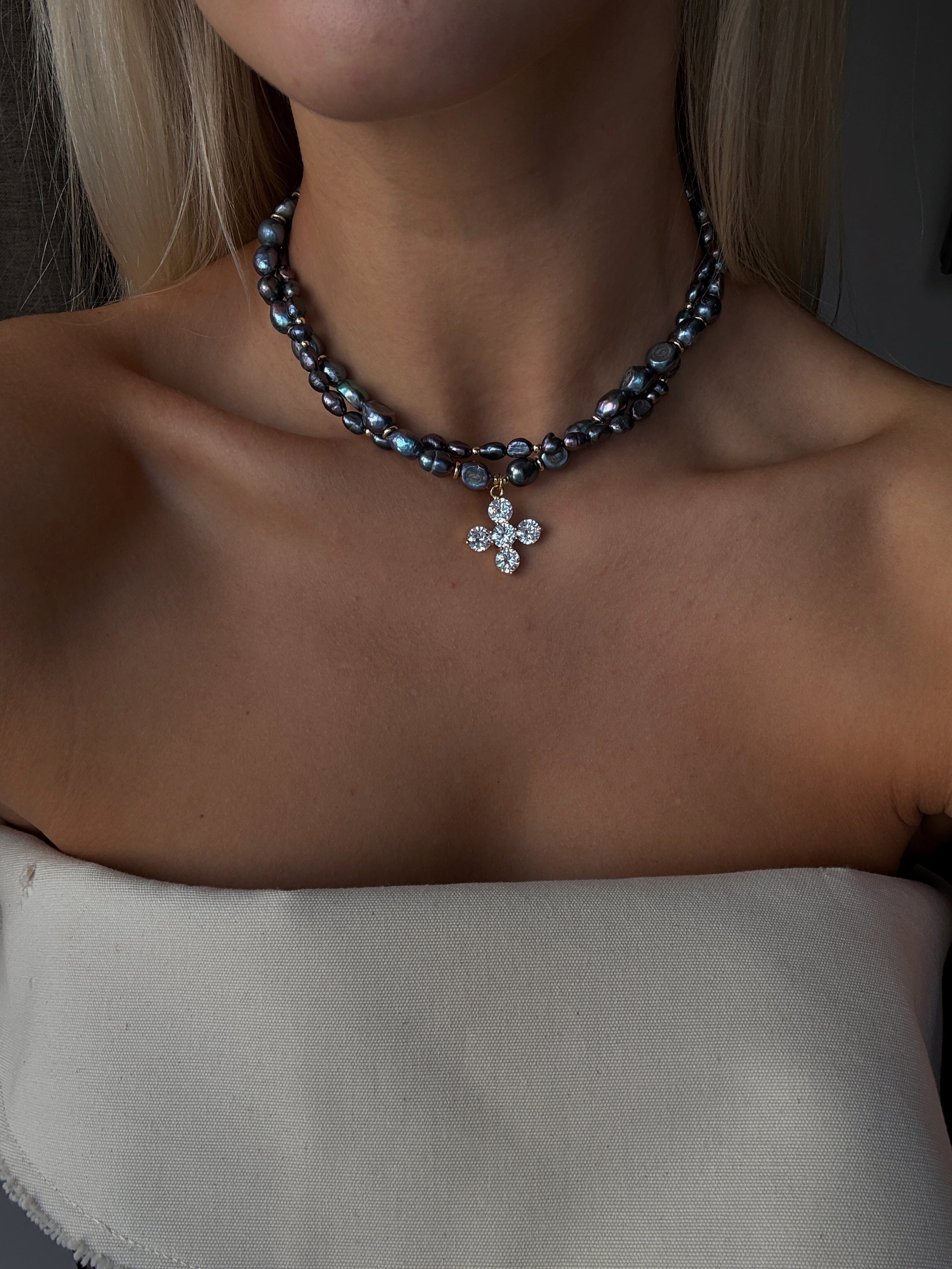 Кольє - чокер з натуральних річкових перлин темного кольору з дуже красивим переливом відтінків. Хрестик інструктований фіанітами.