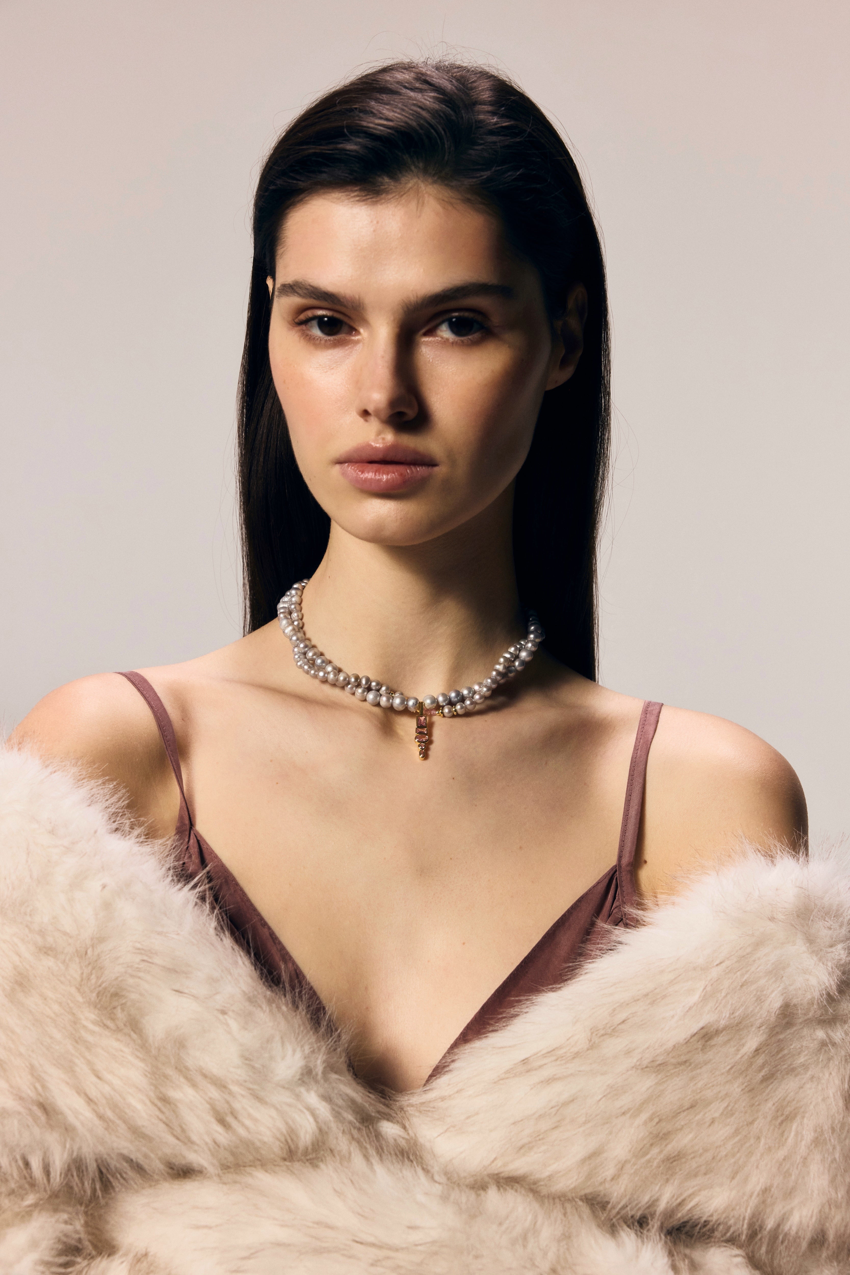 Кольє з натуральних річкових перлин сірого кольору, переплетених між собою. Вставка з цирконів рожевого кольору