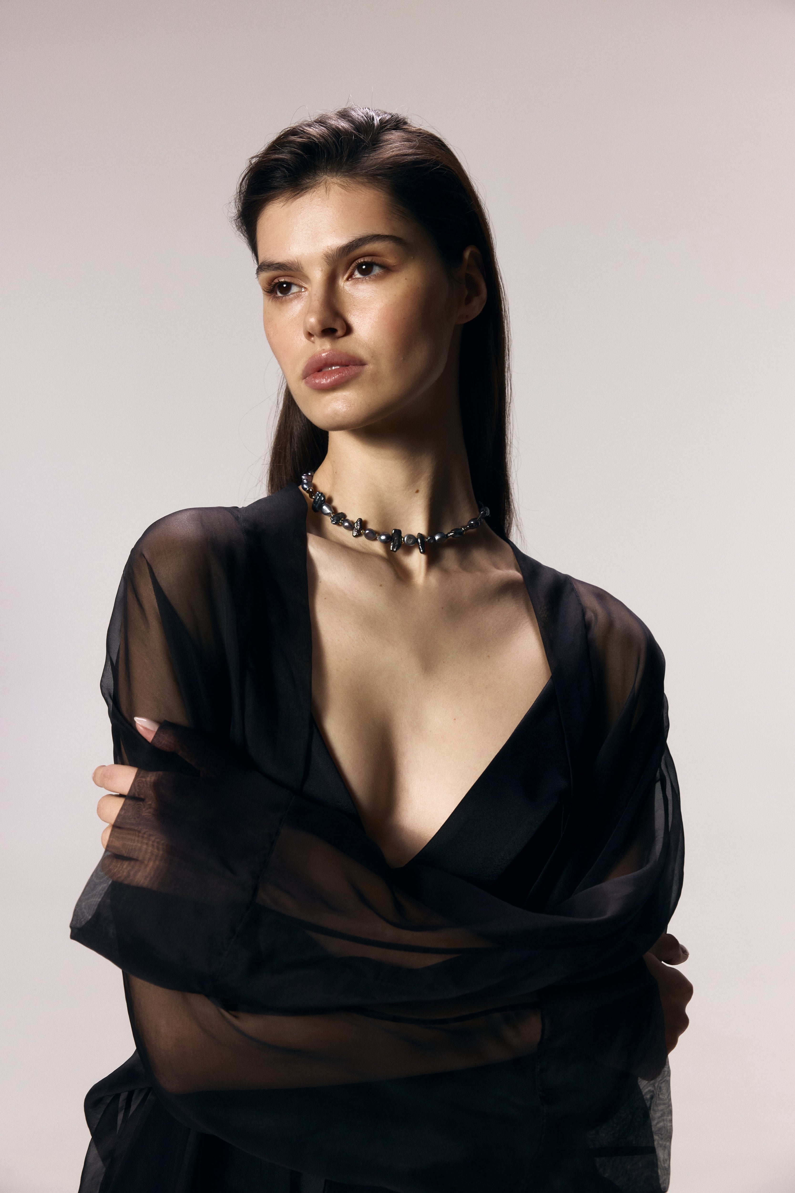 основа - спеціальний ювелірний трос, який тримає форму, при цьому приймаючи форму вигинів тіла, що забезпечує гарну посадку на будь якому варіанті довжини кольє
