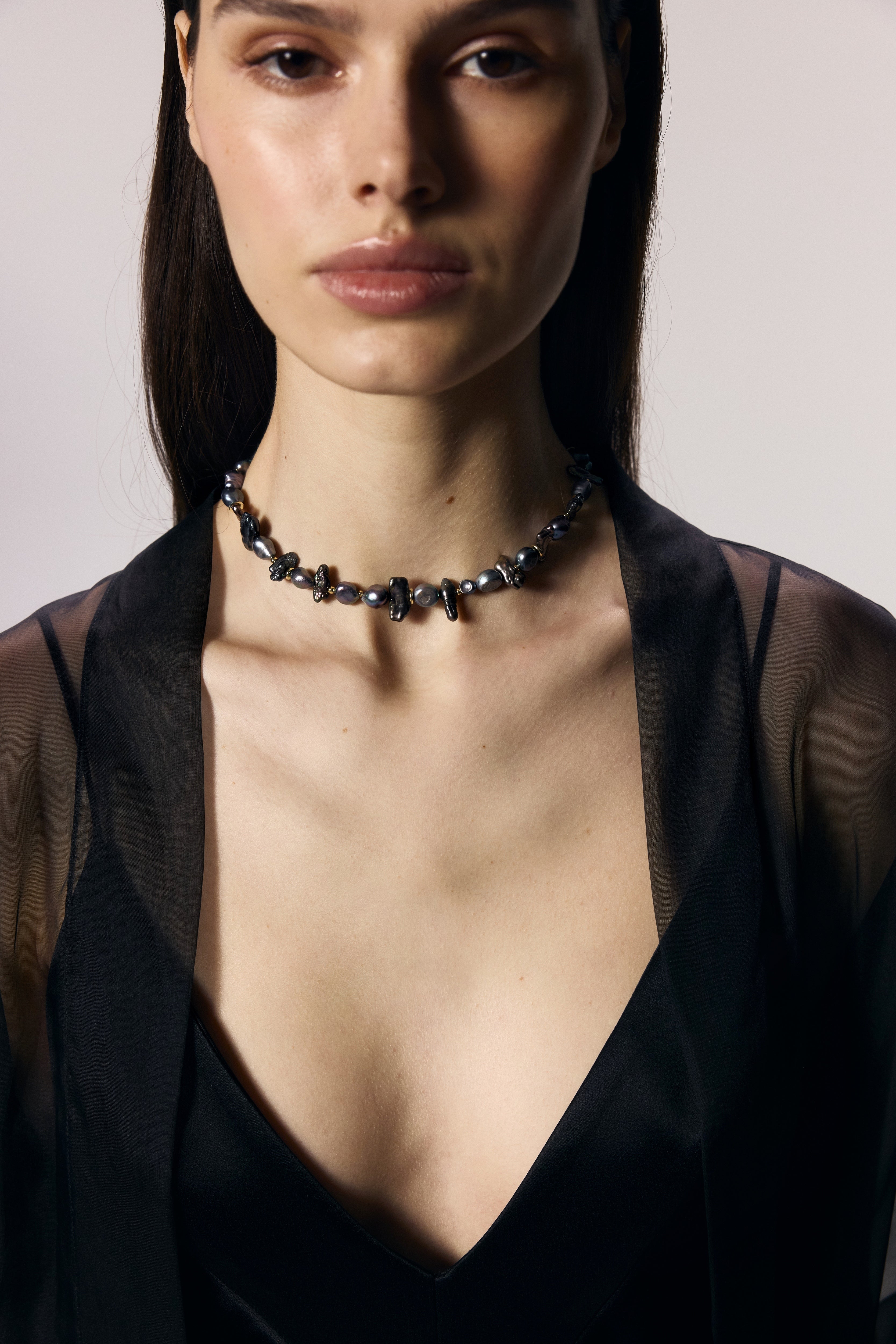 Кольє - чокер з натуральних річкових перлин кеші темного кольору - декілька форм та розмірів в одному кольє.