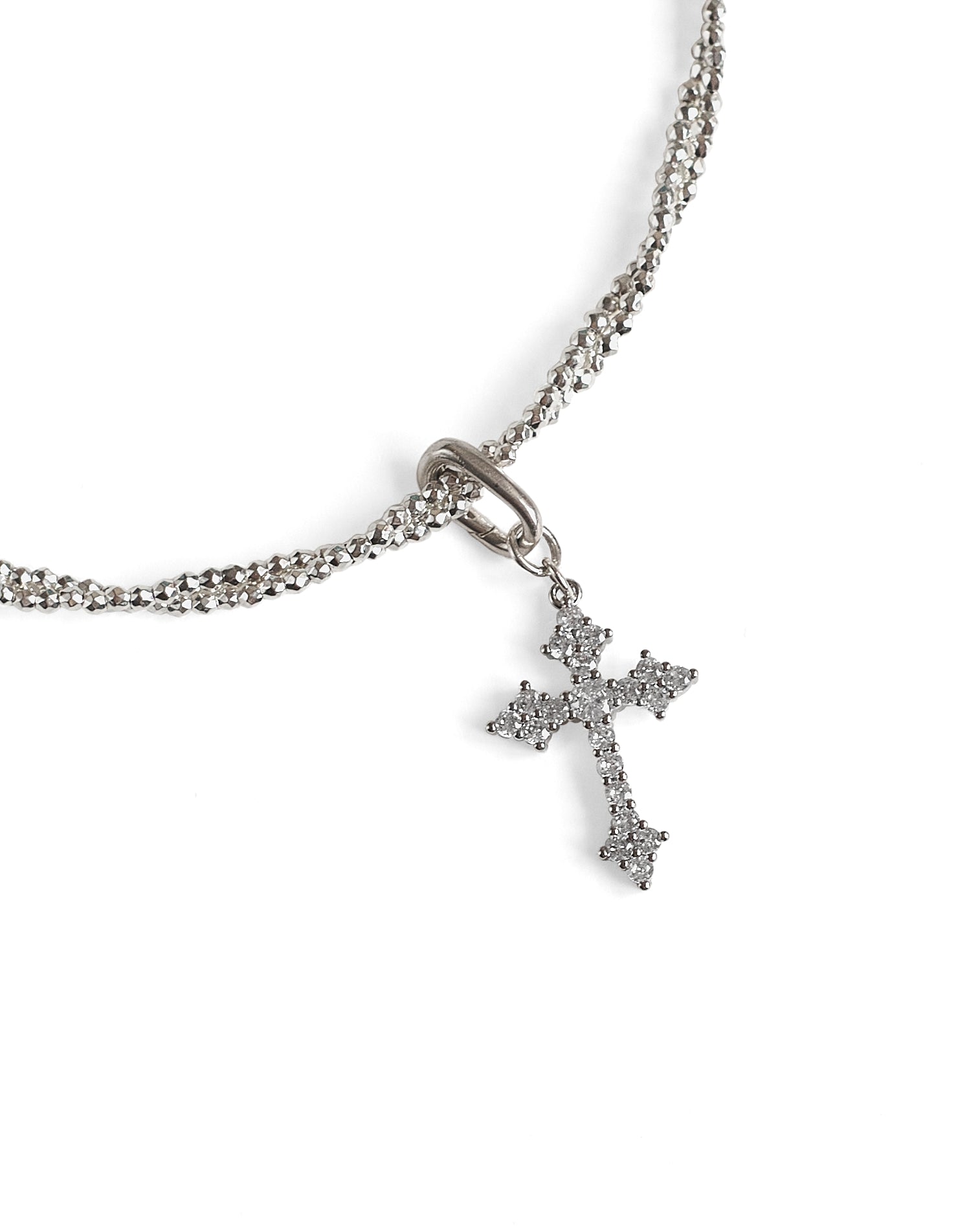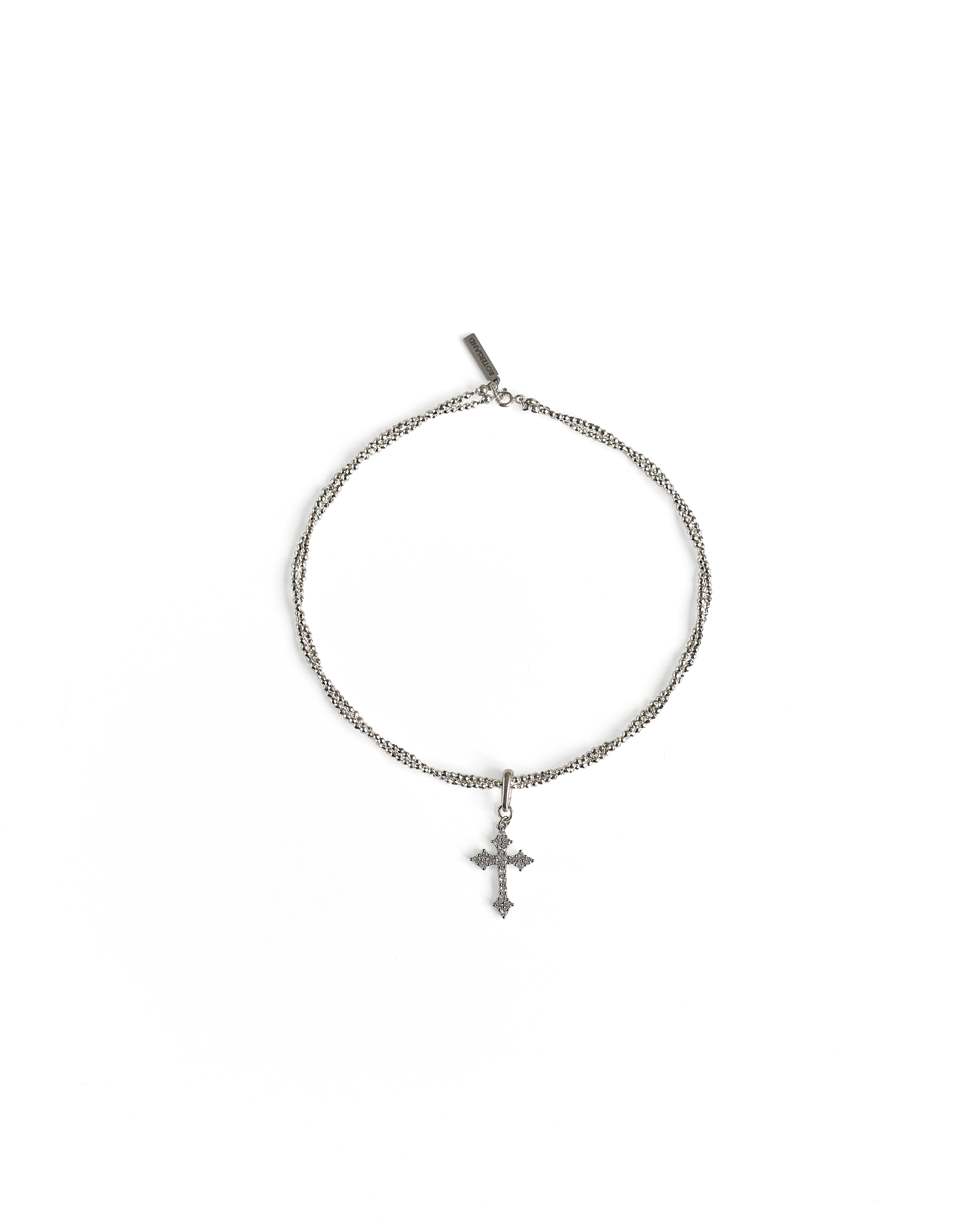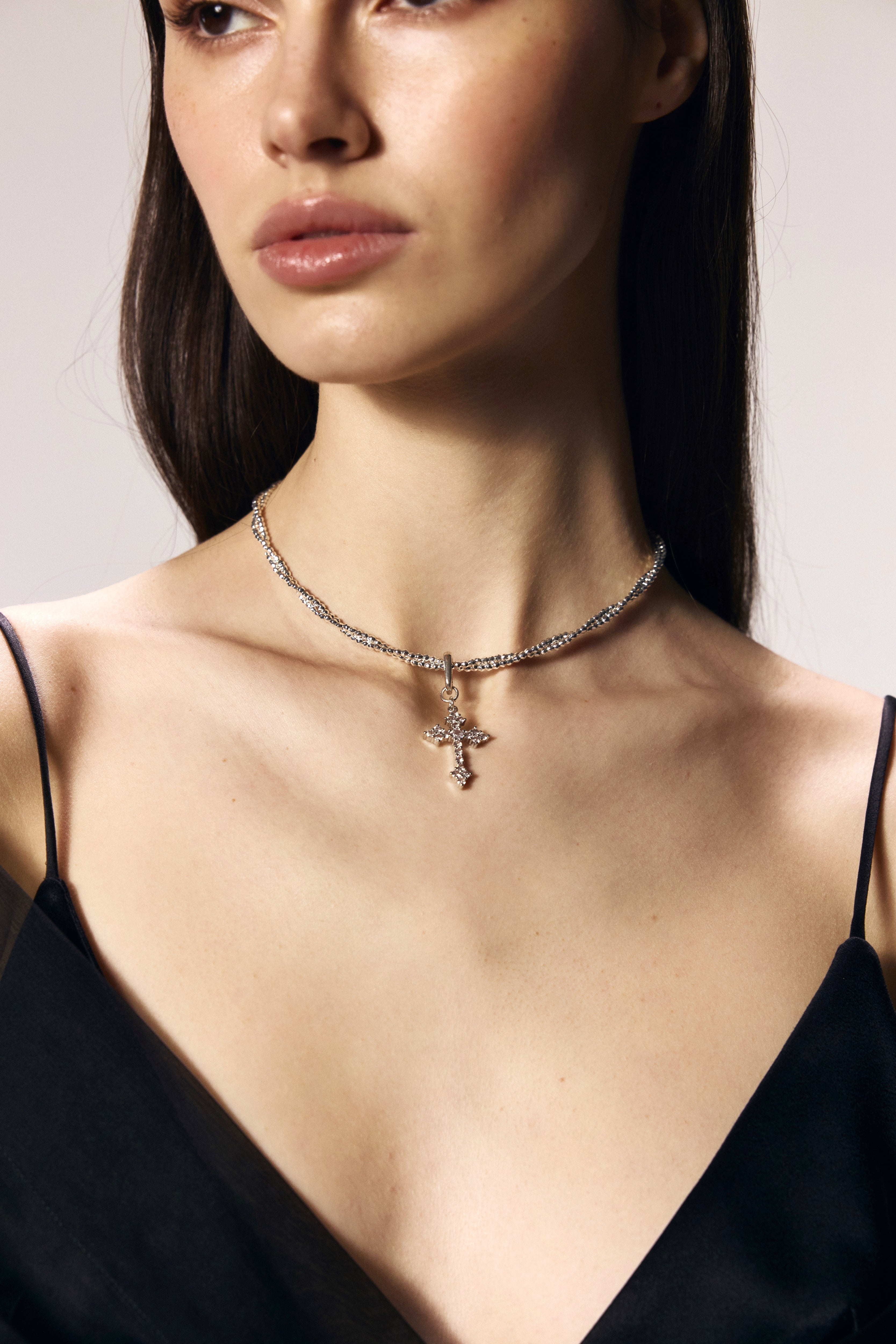 Кольє з гематитових низок, переплетених між собою. Вставка хрестик - інструктована фіанітами білого кольору (зʼємна)