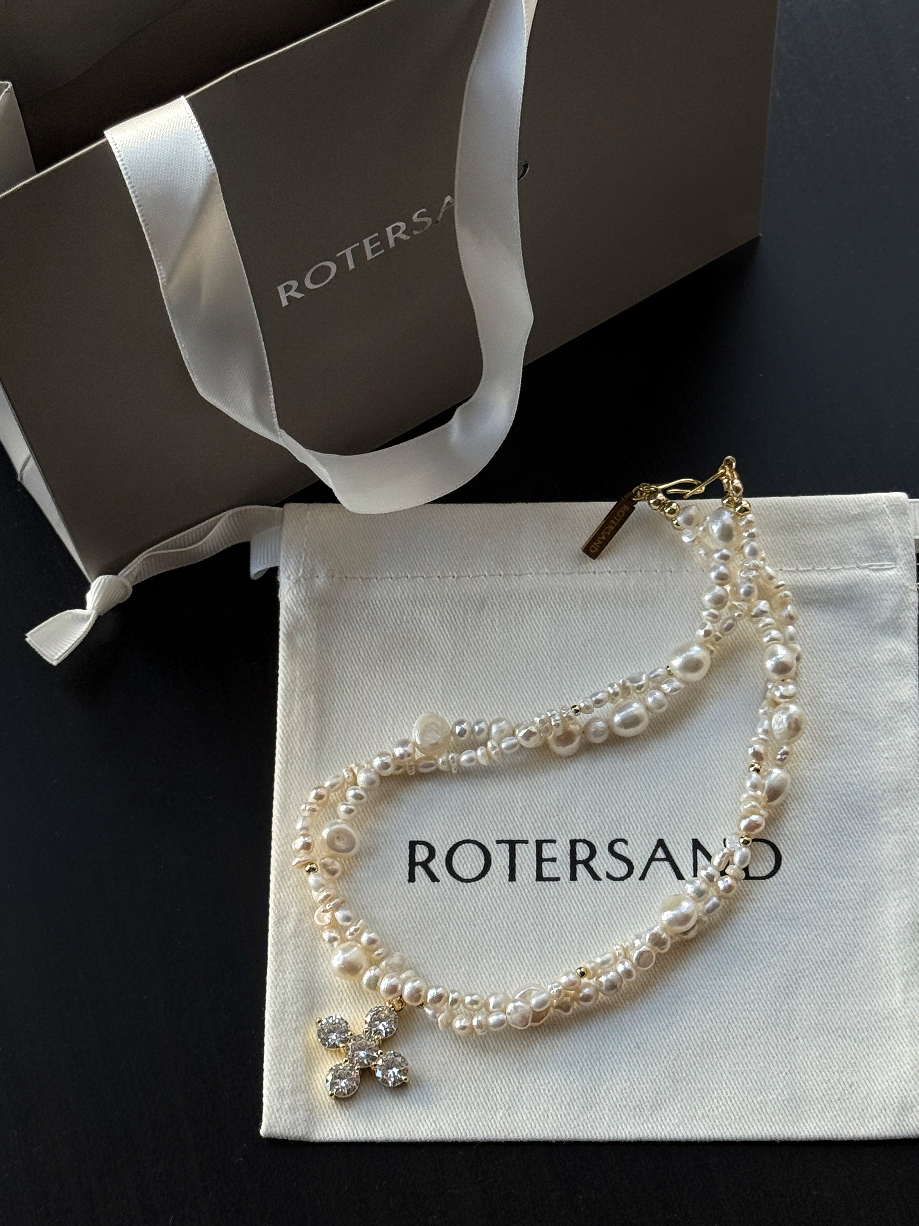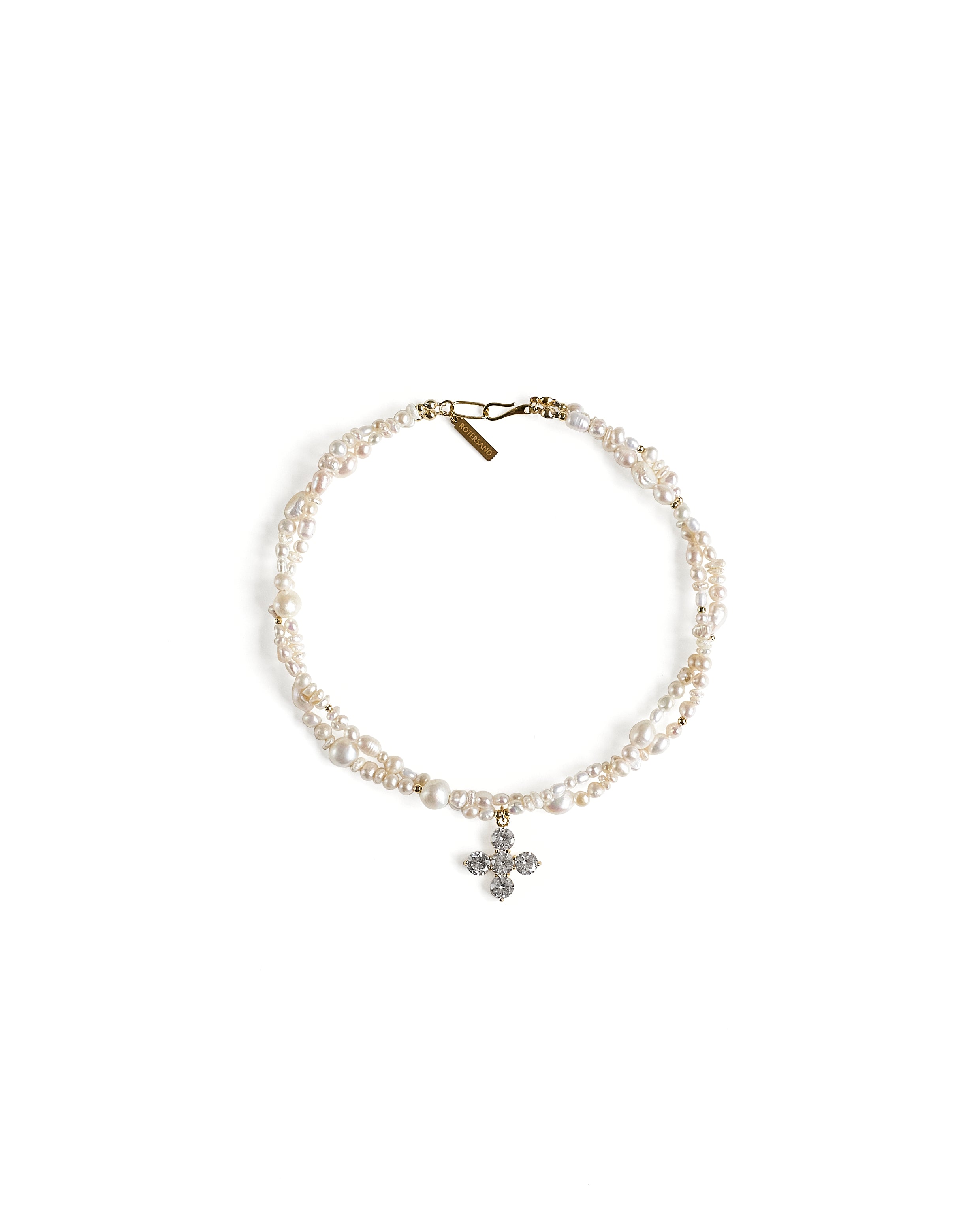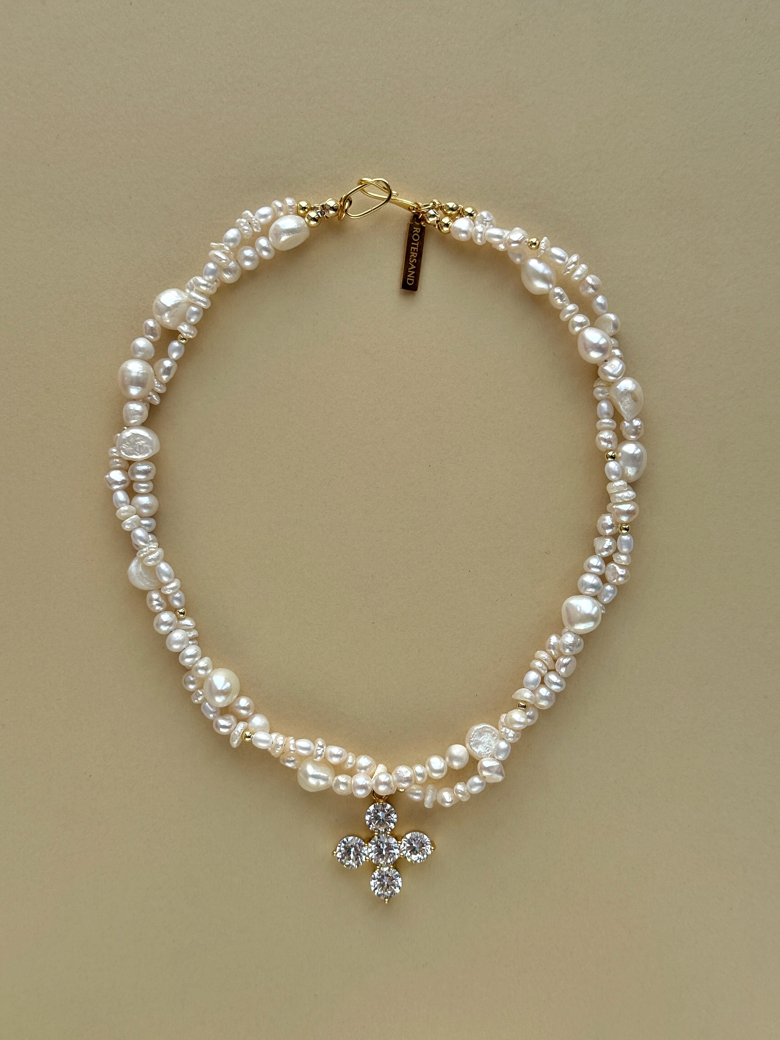 Кольє з натуральних річкових перлин білого кольору, переплетених між собою. Більше чотирьох різновидів форми та розміру в одному кольє.  Вставка хрестик - інструктована фіанітами  білого кольору